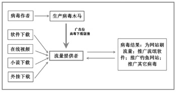 李铁军表示,病毒传播的最终目的和手段在这几年也悄然发生改变。以前病毒传播者多采用网络游戏盗号木马,但用木马盗号变现的环节较多,不易操作。另外,如今的互联网形势正发生巨大变化,网购成为最大众化的需求,调查显示,大约有三分之一的网民经常浏览在线购物网站。于是病毒产业链的从业者也从中瞧出“商机”:他们发现,利用病毒传播可以有多种获利方式:可以为商业网站刷流量参与分成;将网民骗到钓鱼网站直接骗钱;分发某些商业软件,赚取推广费;也可继续分发盗号木马。