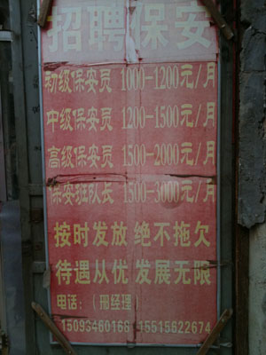 在郑州火车站布厂街附近,沿着一条窄窄的胡同走进去,一栋两层小楼毫不起眼地立在三岔路口,第二层的部分外墙甚至都没粉刷,红色砖头清晰可见。楼下是一块“招聘保安”的广告牌,因为风吹雨淋,底色已经由红变白。上面依次写着初级、中级、高级保安员以及保安队长的月薪,并且承诺“按时发放,绝不拖欠,待遇从优,发展无限。”