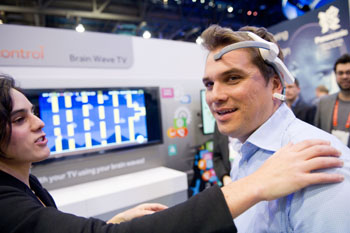 在今年的拉斯维加斯举行的全球最大国际电子消费展上,观展者正在使用海尔集团展示的脑电波电视,这种电视可以借助一个头套通过脑电波在电视屏幕上进行游戏。新华社记者