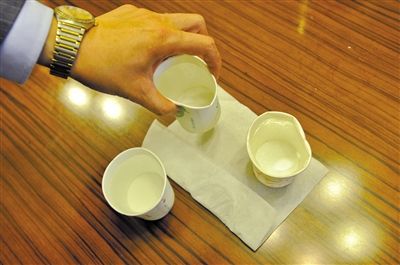 实验结果:半个小时后,1号纸杯和2号纸杯已经严重变形,完全端不起来了。而批发市场的3号纸杯因比较厚,并未出现变形。不过,此时挪开3个样品纸杯,1号杯和2号杯的餐巾纸上没有水渍痕迹,但搁放3号杯的餐巾纸处有少许水渍痕迹,说明有少量渗水。
