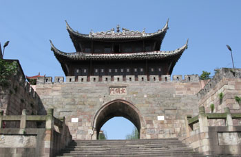 文明门城楼位于南溪城区最南端,背街临江,地势险要。长江从文明门前奔腾流过。文明门始建于明正德年间(1505-1521年),城楼矗立在6米多高的石城墙上,整座城门通高17.35、厚7.5米,门额上有知县邵兆禄于1807年书写的三个遒劲有力的大字“文明门”,城楼外有62级石质台阶与码头相连。这里既是县城的南大门,也是曾经的军事要地。