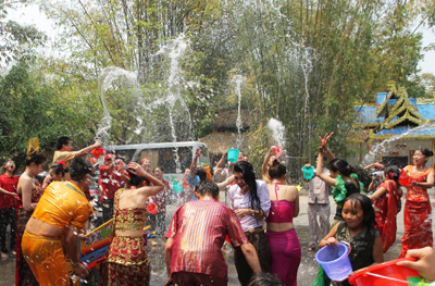 泼水节,德宏傣语称“摆爽南”,德昂语称“拱拍”,阿昌人称“浇花节”。它是傣历新年,也是佛教节日,即浴佛节或佛诞节,是从印度的“洒红节”和到圣河沐浴的习俗衍变而来。