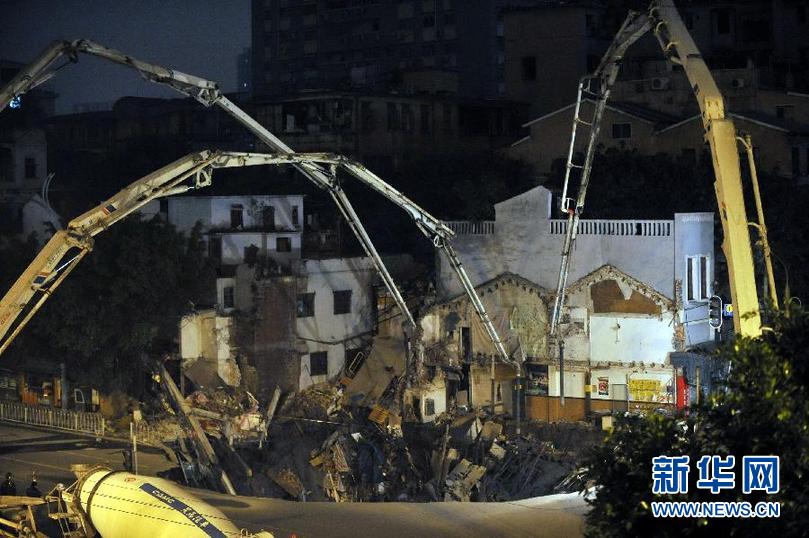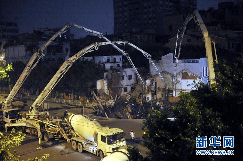 记者28日晚8时俯瞰事故现场看到,塌陷处西延至康王南路主干道,南伸向杉木栏路的斑马线,约25米长,15米宽,呈碗状,深约10米,宛如城市地表的伤疤。地陷区域内的商铺砖瓦残余已基本清理完毕,但仍可见周边残垣断壁的痕迹。10余辆混凝土搅拌车拥挤在杉木栏路上,依次给3架混凝土输送车输送灌浆,混凝土输送车通过吊臂将灌浆输入地底回填,防止塌陷扩大。