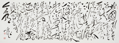 周鹏飞钟情并致力于弘扬和光大毛体书法艺术,在雄浑苍穆的笔意上,把毛体书风作为自己不懈的追求和延展的方向——不求貌似,但求神同;求书法之变,更求伟人之道:把一篇字当作一个字写,无论是字的结构、笔画,还是笔势、布局,都视为一个整体,对立而统一,结构有长短,笔画有粗细,笔势有动静,布局有疏密,整幅作品协调统一,整体感有诗的视野,恰似“背负青天朝下看”。