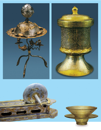 整体取莲花造型,由盖、台盘和足架构成,上饰鎏金摩羯纹。