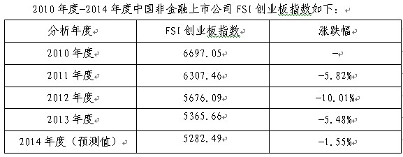 2014年,FSI中小板指数同比下降了269.16个基点,降幅为-4.68%。