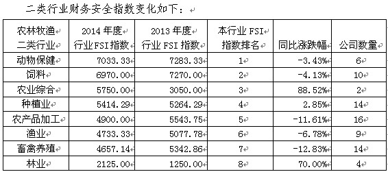 二类行业中,农业综合行业财务安全状况快速上升,2014年投融资趋势为正面。种植业整体财务安全性较高,同比保持增长,2014年投融资趋势为稳定偏正面。动物保健行业和饲料行业财务安全状况良好,2014年投融资趋势为稳定。渔业、畜禽养殖行业和林业FSI指数低,且多数行业指数出现大幅下降,这3个行业2014年投融资趋势为负面。