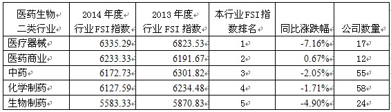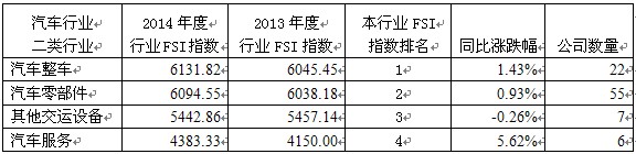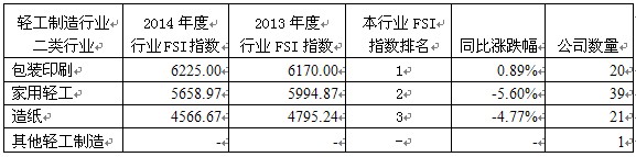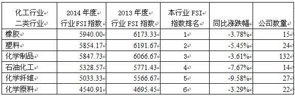 2014年,房地产行业FSI指数为2097点,在所有行业中排名倒数第1位。指数同比下降,降幅为-11.89%,降幅排在所有行业第2位。