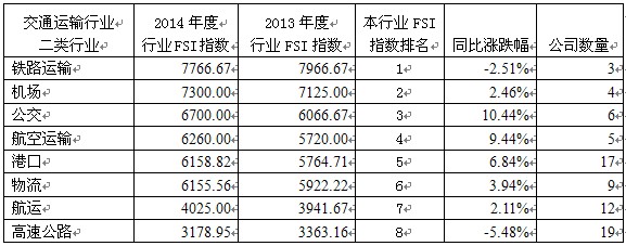 机场行业、公交行业、航空行业、港口行业和物流行业财务安全较好,近年FSI指数平稳上升。航运行业近年来变化较小,财务安全状况低于其它交通运输行业。高速公路行业近4年来财务安全状况一直下降,2014年又较快速下跌,降幅为-5.48%,风险很大。