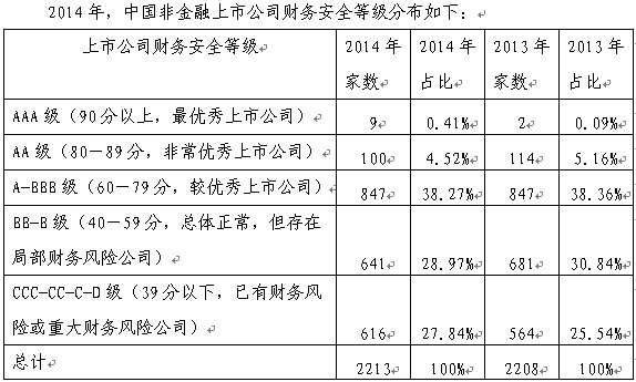 2014年,在全部非金融上市公司样本中,中国财务安全最优秀上市公司(AAA级以上)有9家,占所有非金融上市公司总数的0.41%,最优秀上市公司比2013年多7家;较优秀上市公司(AA级以上)100家,占比4.52%,低于2013年的5.16%和2012年的8.83%。总体看,中国财务优秀上市公司正在逐年减少。同时,2014年已出现财务风险或重大财务风险的上市公司(CCC级以下)比例为27.84%,有616家,高于2013年的25.54%和2012年的23.59%,出现财务风险上市公司的数量正在不断增加。