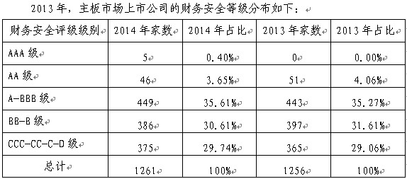 从其他各财务安全级别的比例看,2014年和2013年变化极小,说明2014年主板上市公司的整体财务安全状况与2013年基本持平。