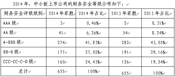 从2014年与2013年中小板财务安全等级同比分析来看,2014年,较优秀上市公司(AA级以上)44家,低于2013年的56家,说明中小板财务安全优秀上市公司正在减少。同时,2014年已出现财务风险或重大财务风险的中小板上市公司(CCC级以下)总占比为24.43%,远高于2013年的19.24%和2012年的15.25%,说明近年来中小板上市公司的财务风险正在逐步扩大。