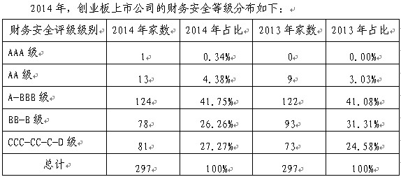从2014年与2013年财务安全等级同比分析来看,2014年,财务安全较优秀上市公司14家,高于2013年的9家。但是,2014年已出现财务风险或重大财务风险的创业板上市公司(CCC级以下)有81家,超过2013年8家。同时,创业板出现财务风险上市公司的比例也高于中小板。