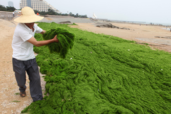 浒苔绿潮今年将再次涌向山东部分沿海地区,绿色絮状的浒苔又将堆积在沙滩上,发出一股股浓烈的海草腥味,工人又要整车整车地将它们拉到填埋场处理。从2007年以来,这已是浒苔绿潮第8次影响山东部分沿海地区,冲击沿海旅游业并威胁养殖业。