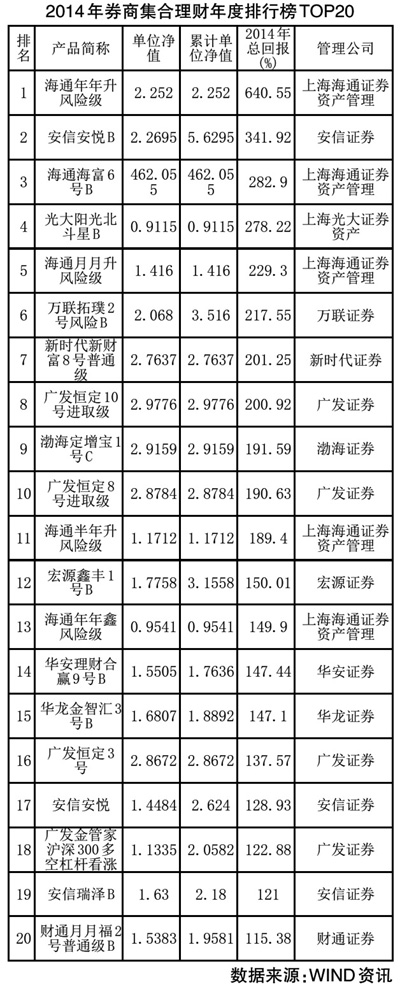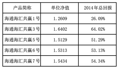 2014年,海通年年升风险级、海通海富6号B份额、海通月月升风险级、海通半年升风险级与海通年年鑫风险级等5只产品均进入券商集合理财排行榜前20名,回报率分别达640.55%、282.90%、229.30%、189.40%与149.90%,位列第1名、第3名、第5名、第11名与第13名。