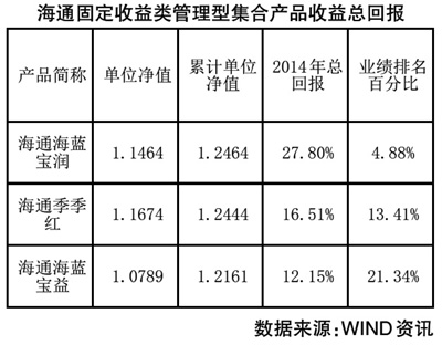 管理型产品中,由固定收益部总监杨贵宾管理的海通海蓝宝润实现收益27.8%,位居同类产品的前5%;此外,由投资经理张承启管理的海通季季红和海通海蓝宝益排名也分别居于同类产品前14%和前22%。