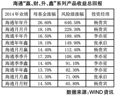 分级产品方面,海通“赢、财、升、鑫”系列产品无论是风险级涨幅,还是母基金收益率均居市场前列。海通年年升风险级2014年回报更达640.55%,是目前业绩最好的分级债券产品。其母基金收益率也达到26.8%,位列公募基金排名前10%。