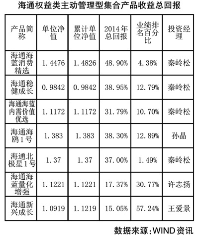 海通资管权益类产品2014年的平均收益率达到32.5%,排名位列同类产品的前1/4,由权益投资部总监秦岭松管理的海通海蓝消费精选年度收益达到48.9%,排名位列同类产品的前5%。去年4月初成立,由投资经理孙晶管理的海通海鸥1号于9月下旬成立,由秦岭松总监管理的海通北极星1号,双双在较短时间内斩获了38.3%与37%的年度总回报,排名位列同期发行产品的前13%与前2%。