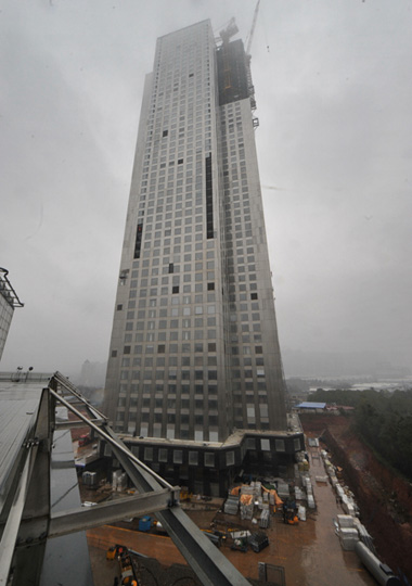 湖南远大可建公司采取模块化建造技术用19天时间在长沙建造的57层高楼施工现场。 据施工方介绍,大楼采用可持续建筑模块化材料,95%的工程量在工厂内完成。大楼外墙采用多种特有技术,据称比常规建筑节能80%。