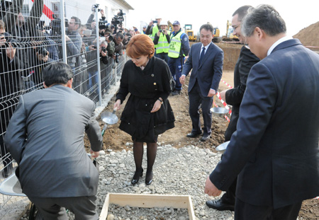 2015年4月7日,罗马尼亚南部的克拉约瓦市,中国山东宁建建设集团在该市的居民公寓项目正式开工,图为宁建董事长杨根才(左一)、克拉约瓦市长瓦西列斯库女士(左二)、罗总理蓬塔(右二)和中国驻罗大使徐飞洪(右一)在开工仪式上。