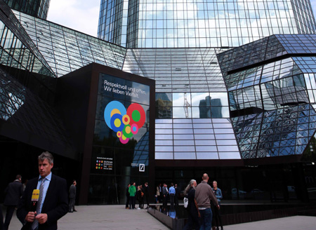 图为当日媒体记者和工作人员聚集在德国法兰克福德意志银行总部大楼前。