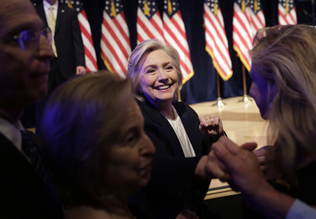 7月13日,美国民主党总统候选人希拉里·克林顿在纽约曼哈顿岛的一所学校发表演讲。希拉里·克林顿表示,应当建立一个不断增长的公平的经济体系,真正提高普通美国人的收入。图为希拉里·克林顿演讲后与支持者握手。