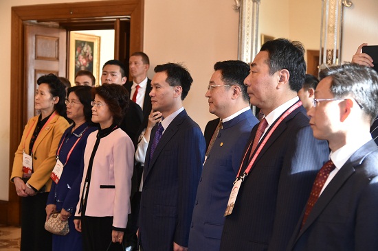 中国华信董事局主席叶简明与中国驻捷克大使马克卿(左三)、中国东方航空有限公司党委书记李养民(右二)、北京二商集团有限公司董事长孙杰、北京市政路桥集团有限公司党委书记、董事长郝志兰、中国核工业集团公司欧洲市场开发副总裁谢嘉杰共同出席捷克总理与企业家代表见面会