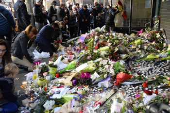 11月15日,在法国首都巴黎第11区的一处悼念地,人们纷纷献上鲜花,点燃蜡烛,哀悼恐怖袭击中的死难者。 15日至17日,法国为此次恐怖袭击的死难者举国哀悼三天,各类机构将降半旗志哀。 新华社/法新 |