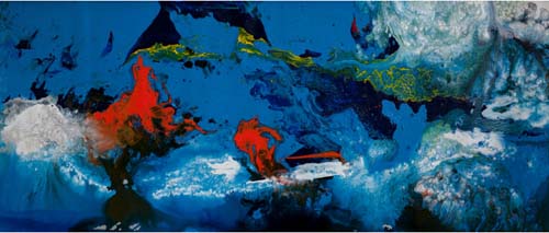 “在他最引人注目的作品中,有一些是荷花题材。例如作品《溢彩流金》,在层叠的颜色中泼入金色,以这样的方式界定绘画空间,仅仅是为了突出荷花。仿佛它撇开了所有支撑它的东西,无论从下面还是上面。唯一除外的是一些茎,它们像是书法的笔画,延伸到图画空间的下边缘。画面描绘的是开花的形态,仿佛悬浮在空间里只有它们自己。” 约翰·赛利斯表示,有些花朵看上去像是液体,这种轻盈流动的特性使得它们超越了花的形态,甚至幻化成色彩斑斓的其他有可能变成的形态,只是有可能,并不一定。在那些有着清晰轮廓的花朵的烘托中,初始色彩流动的美感得到突显。