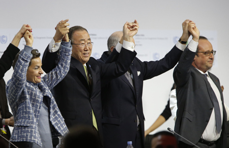 12月12日,在巴黎北部市郊的布尔歇展览中心,《联合国气候变化框架公约》秘书处执行秘书菲格雷斯、联合国秘书长潘基文、巴黎气候变化大会主席法比尤斯与法国总统奥朗德(从左至右)一起牵手,庆祝巴黎气候协议达成。