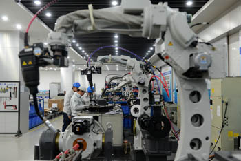 河北省唐山市机器人产业基地是“国家火炬计划特色产业基地”。基地集机器人本体研发、生产、销售、技术服务为一体,2015年基地内核心企业实现产值36.8亿元。图为唐山松下产业机器有限公司工作人员在对焊接机器人进行测试。记者 牟宇 摄
