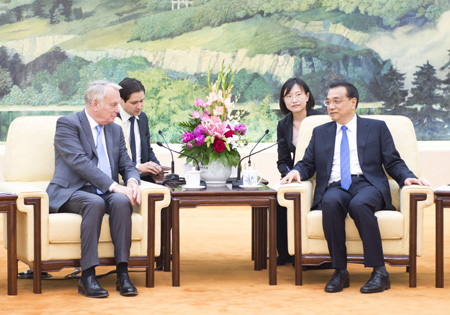 5月16日,国务院总理李克强在北京人民大会堂会见来华进行正式访问的法国外长艾罗。李克强指出,今年以来,中国经济运行总体平稳,结构调整和转型升级出现好的势头,金融运行稳定,债务处于可控水平。虽然世界经济复苏乏力,中国发展也要应对多重困难和挑战,但我们通过全面深化改革、积极扩大开放,有能力保持经济运行在合理区间和长期向好的基本面。
