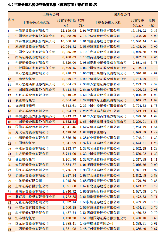 4月份,中国证券金融股份有限公司托管金额为4,652.68亿元,北京凤山投资有限责任公司托管金额为1,725.35亿元。