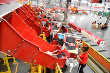“6.18”网购狂欢日期间,位于河北固安的京东集团固安智能物流中心一片繁忙的景象。 记者 陈晔华/摄 |
