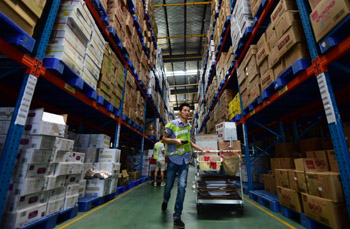 良品铺子物流仓库内一片繁忙的景象。记者 程敏 摄 |
