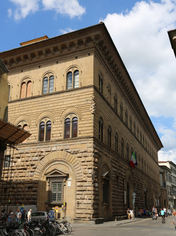 佛罗伦萨大教堂正前方有一条南北向的大道,向北通向梅迪奇宫(Palazzo Medici),又南通向的佛罗伦萨的市政厅广场。有趣的是,佛罗伦萨文艺复兴运动的早期文化产品大多位于梅迪奇宫这个方向,而晚期的作品大多集中在市政厅方向,当然这只是一个粗略的划分,并不绝对。梅迪奇宫是文艺复兴早期古典化风格的私人宫室的杰出代表。1434年梅迪奇家族掌握佛罗伦萨的统治权后开始筹建,并为此举行了设计比赛,最终,建筑师米开罗佐击败布鲁内莱斯基赢得了此项工程。曾参观过该宫室的教宗庇护二世在其回忆录里指出,梅迪奇宫的规模和气势堪比王宫,他由此窥见了梅迪奇家族的王朝野心(图3)。梅迪奇宫的营建激发了佛罗伦萨豪门家族兴建宫殿的热潮,如鲁切拉伊宫、斯特罗奇宫、皮蒂宫等。这些宫殿不仅仅是家族成员的居所,更是家族权力、财富、地位以及高雅趣味的标志,“古代风格”的采用是审美趣味与政治、社会考量密切交织的结果。