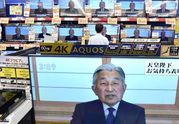 日本明仁天皇8月8日下午发表视频讲话,流露出“生前退位”意向。日本首相安倍晋三当天表示将对此予以认真考虑。新华社/法新 |