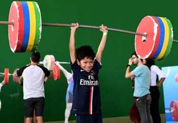 里约中心体育馆是2016年里约奥运会举重、拳击、乒乓球和羽毛球项目的赛场。主办方特地在此准备了这几项运动的场地、相关器材和模拟道具,便于里约市民和各地游客前来体验奥运项目,享受运动乐趣。图为一名男孩(中)在里约中心体育馆体验举重项目。记者 蔺以光/摄 |