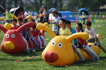 8月8日,2016全国“全民健身日”北京主会场的小朋友们在亲子运动会项目里进行“快乐毛毛虫”比赛。记者 鞠焕宗/摄 |