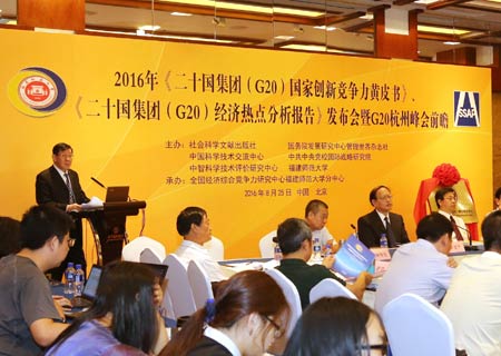 当日,《二十国集团(G20)国家创新竞争力发展报告(2015——2016)》黄皮书在北京发布。黄皮书显示,美国、英国、日本位列二十国集团(G20)各成员前三名,中国排名在第9位,是G20集团中唯一进入前十名的发展中国家。新华社发(刘芳摄)