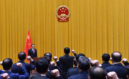 根据《全国人民代表大会常务委员会关于实行宪法宣誓制度的决定》和《国务院及其各部门任命的国家工作人员宪法宣誓组织办法》,今年以来国务院任命的38个组成部门、直属特设机构、直属机构、办事机构、直属事业单位的55名负责人依法进行宪法宣誓。新华社记者 谢环驰/摄