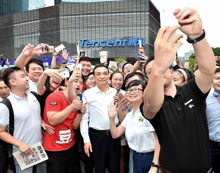 这是10月12日,李克强在深圳全国“双创”周活动主会场深圳湾创业广场与年轻创业者合影留念。新华社记者 李涛/摄