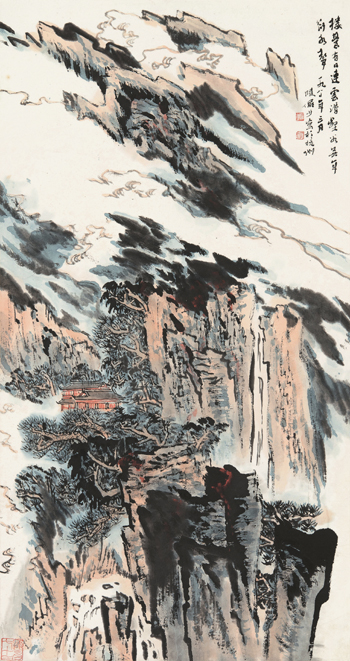 陆俨少 云山楼阁图 纸本镜心 90×48 cm 成交价:RMB 1,610,000 |
