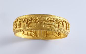 手镯,又称“钏”,为套在手腕上的环形装饰品。此次即将上拍的金制手镯呈椭圆形,镯身宽扁沉重,厚薄均匀,用料成色极佳。内圈素面无纹,外以鱼籽纹为地,饰人物故事纹样。上下缘环饰回纹。整体雕刻精美,造型独特,是十分难得收藏、佩戴佳品。