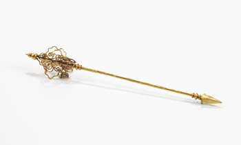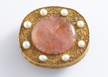 带扣是人们用来束带之物,起到固定和装饰美化的作用,其出现大约在春秋晚期,战国时已较为常见,经过秦汉时期的发展,到两晋时,带扣基本上取代了带钩,不仅成为服饰的重要组成部分,而且在日常生活中也得到了广泛的应用。“金嵌碧玺东珠带扣”通体金水富足,色泽醇厚饱满,光亮夺目。此件带扣椭圆形,金质底托。托上嵌粉红碧玺宝石,宝石晶莹剔透,其周围金丝镶嵌珍珠,珠粒圆润饱满。带扣背部光素,两端焊接金条,用以结系绳扣。