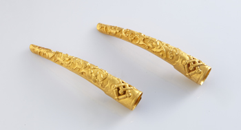 “清乾隆金錾刻蝙蝠纹指甲套”则以金片捶揲弯卷而成,通体细长,由套管至指尖逐渐变细,套管下部中空,表面用纯金雕刻装饰蝙蝠纹和祥云纹,有“洪福齐天”的吉祥寓意。下配金丝扣结纹饰,寓意“同心双合,彼此相通”。清代贵族女子多留长指甲,以凤仙花或指甲花染甲,后戴上金属指甲套,以保护其精心留饰的指甲。指甲套修长秀丽,华贵典雅,成对保存,十分珍贵。