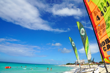 巴拉德罗的加勒比海沙滩上停放很多帆船 |