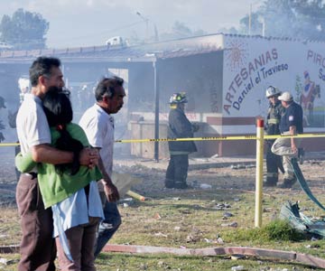 12月20日,在墨西哥图尔特佩克市,人们站在发生爆炸的烟花市场内。