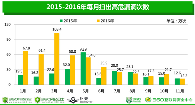近日,360互联网安全中心发布《2016年中国网站安全漏洞形势分析报告》称,过去一年360网站安全检测平台扫描发现网站高危漏洞480.8万次,较2015年267.7万次大幅增长80%,平均每月扫出高危漏洞约45.8万次。