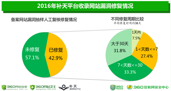 面对防不胜防的网站漏洞,及时修复漏洞是防范信息泄露的重要举措,但360互联网安全中心发布的数据显示,在对于网站漏洞的安全响应上,我国政企用户仍存在很大不足。根据对2016年补天平台的备案网站漏洞的抽样调查,网站漏洞的平均修复率仅为42.9%。
